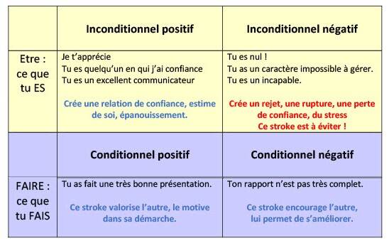Notons que le stroke inconditionnel sera plus intense et plus destructeur que le stroke conditionnel car il touche à la personne en elle-même --> A éviter !